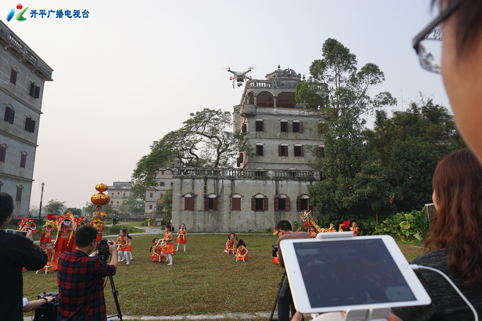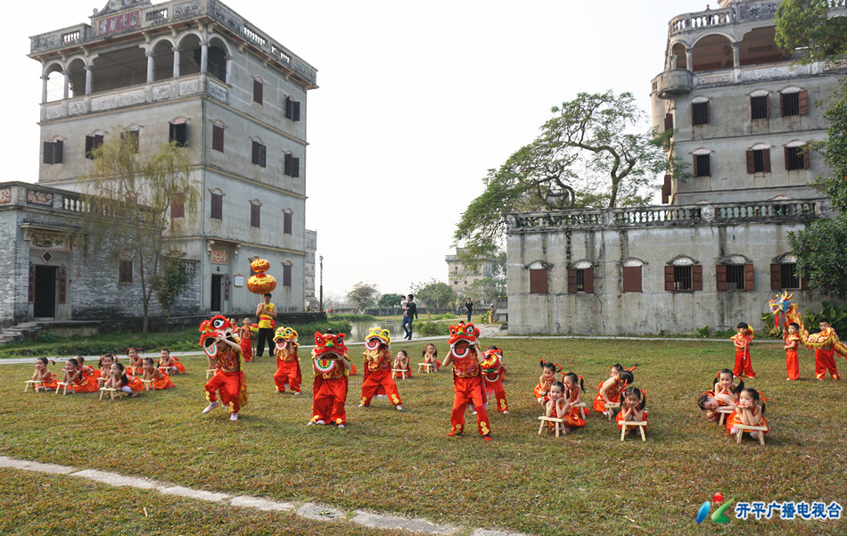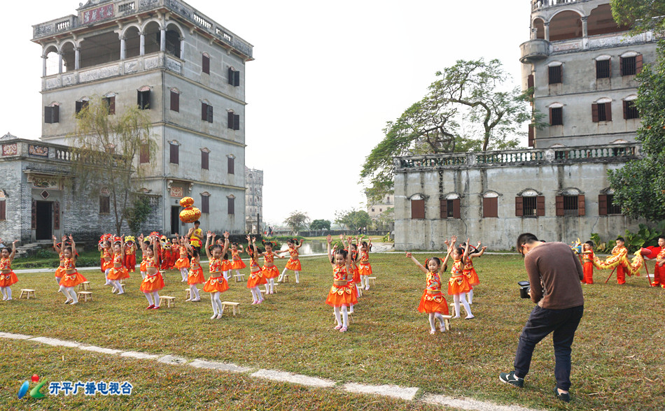 碉楼群中,锣鼓喧天,一个个活泼可爱的小朋友,高举着小板凳,龙腾狮跃,欢欣鼓舞,眼前的这翻景象分外喜庆。这正是开平广播电视台为世界文化和自然遗产城市中国广电媒体联盟2017 春节联欢晚会录制的“侨乡梦圆”现场。