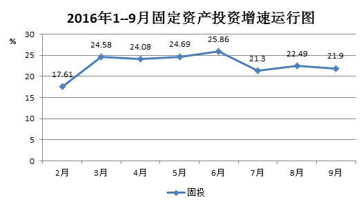 从图中可见,我市投资运行平稳,波动幅度较小。1-9月,我市累计完成固定资产投资162.28亿元,同比增长21.9%。其中:发速度最快的产业是第一产业,累计完成投资2.88亿元,同比增长135.70%。