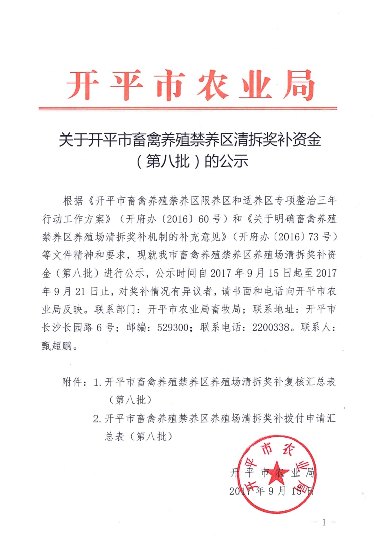 关于开平市畜禽养殖禁养区清拆奖补资金(第八批)的公示