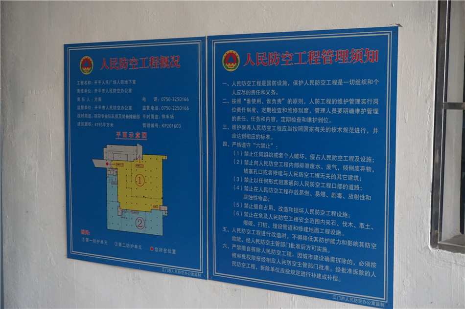 开平市人防应急指挥中心副主任 方南:现在开平市像这样的防空地下室一共有16座,总面积有15万平方米,可以掩蔽的人数是6万人,这个人防地下室的功能就是战时提供给留城人口有躲避的场所,平时遇到重大自然灾害也可以进来掩蔽。